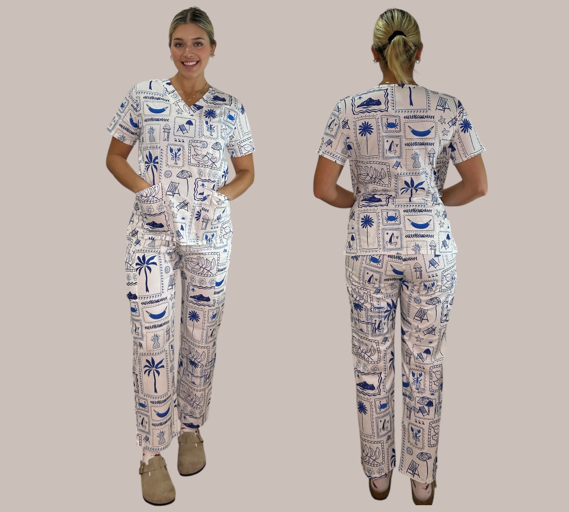 Why wait for a vacay? Our Coastal Postcards scrub pants bring breezy island vibes to your shift β think palms, hammocks, and ocean blues. ππ